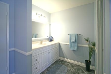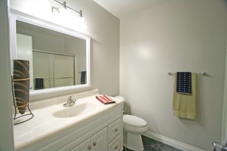 Master Bathroom was highlighted with towels, simple ceramics on counter and plant on floor in corner.